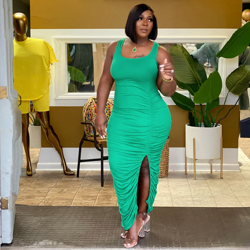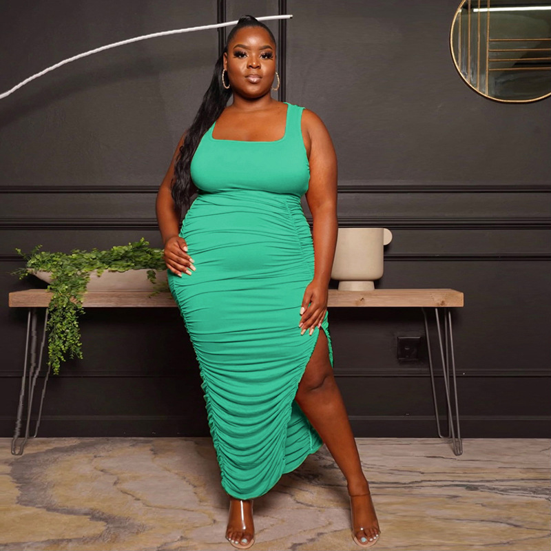 Plus Size Women's Sexy U-Neck Sleeveless Ruched Split Dress