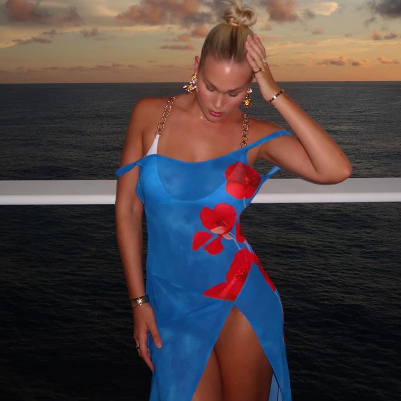 Sexy Backless Printed Summer Split Slimming Maxi Dress for Women